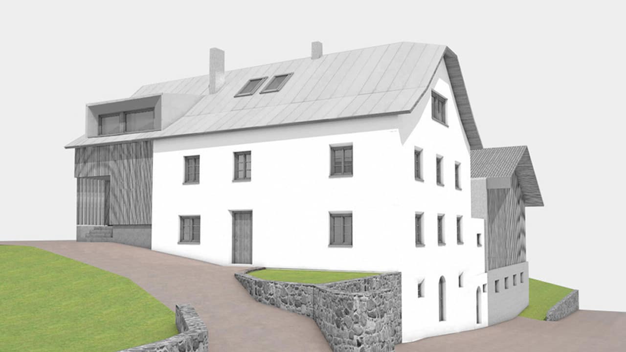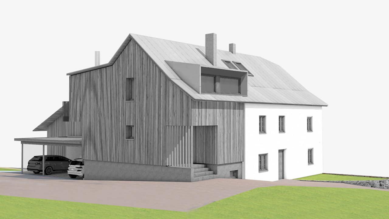 Ein sehr altes ehemaliges Schulgebäude, das nun schon seit langer Zeit als Wohnhaus eines Gehöftes dient, erhält an der Rückseite durch Weiterführung der Gebäudeform eine räumliche Erweiterung. Diese ist Teil einer neu geschaffenen Wohneinheit. Im Dachgeschoss bilden Alt und Neu eine strukturierte Raumfolge, wobei der schöne Dachstuhl des Bestandes auf Sicht belassen wird. Neu gesetzte Lichteintrittsflächen im alten Gebälk bringen ausreichend Tageslicht in diesen spannenden Raum.